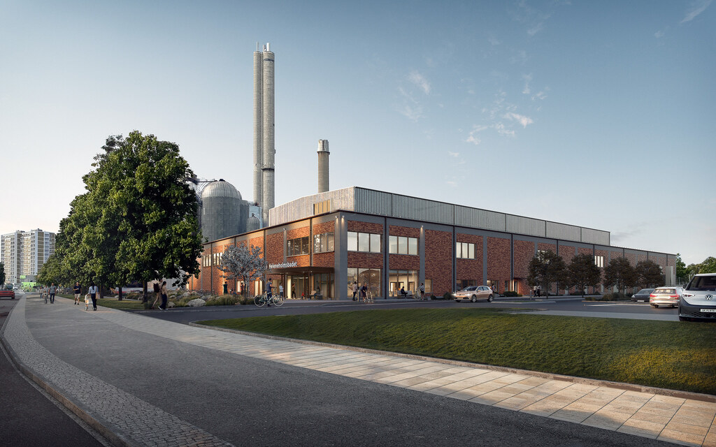 Korrugerad plåt, rött tegel i rakt förband och betong utgör byggnadens exteriöra materialpalett.