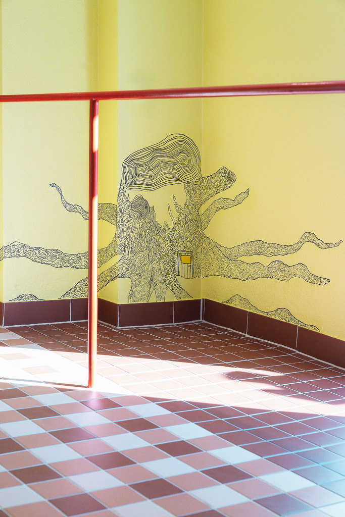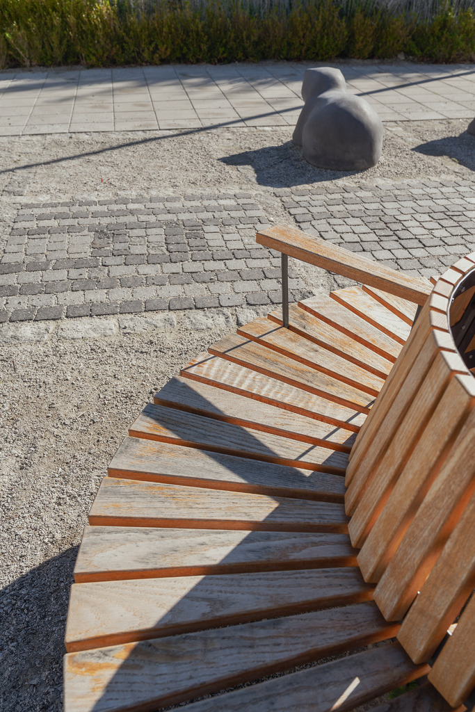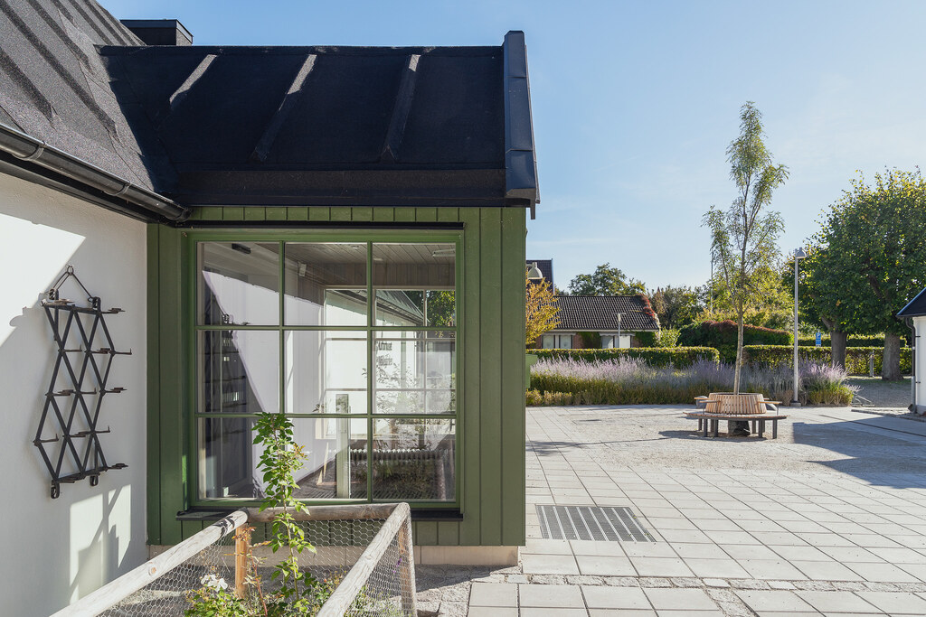 Platsen har en kontinuitet som bostadsmiljö som speglas i gårdens planteringar och träd, samtidigt som den möter de funktioner en offentlig verksamhet kräver. Innan besökaren når entrén till bibliotek och fritidsgård möts hen av en småskalig, nygestaltad mindre gårdsplan som idag fungerar som en generös mötesplats. Ett nytt vårdträd har planterats, och markbeläggningen och planteringen är en blinkning till Charlotte Weibulls vurm för folkdräkter – där starka färger och mönster återkommer i gatstenens mönsterläggning.
