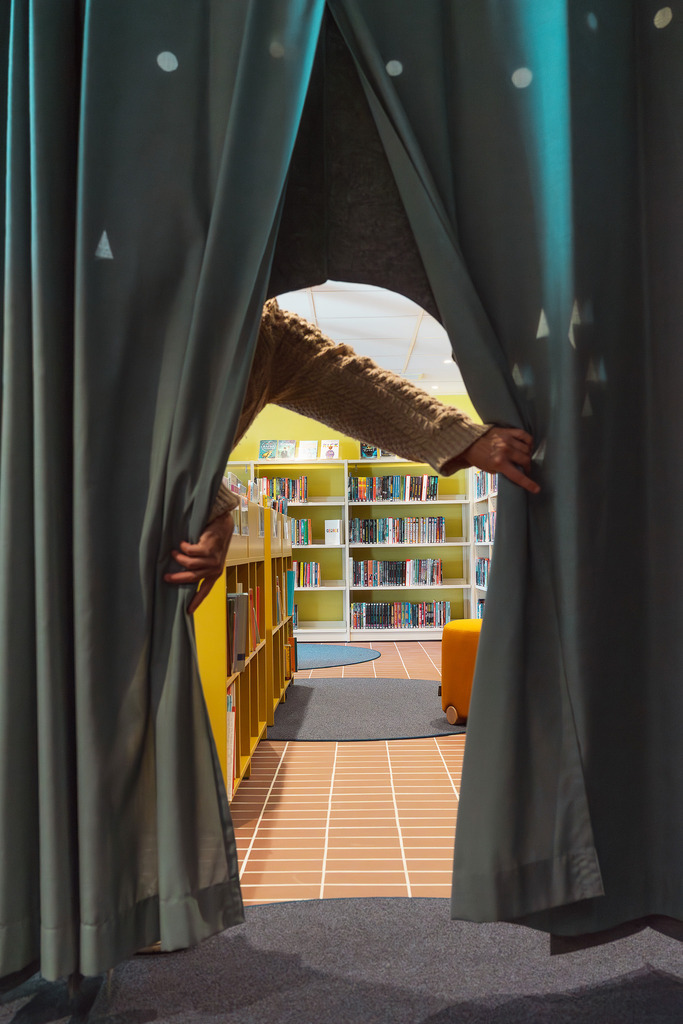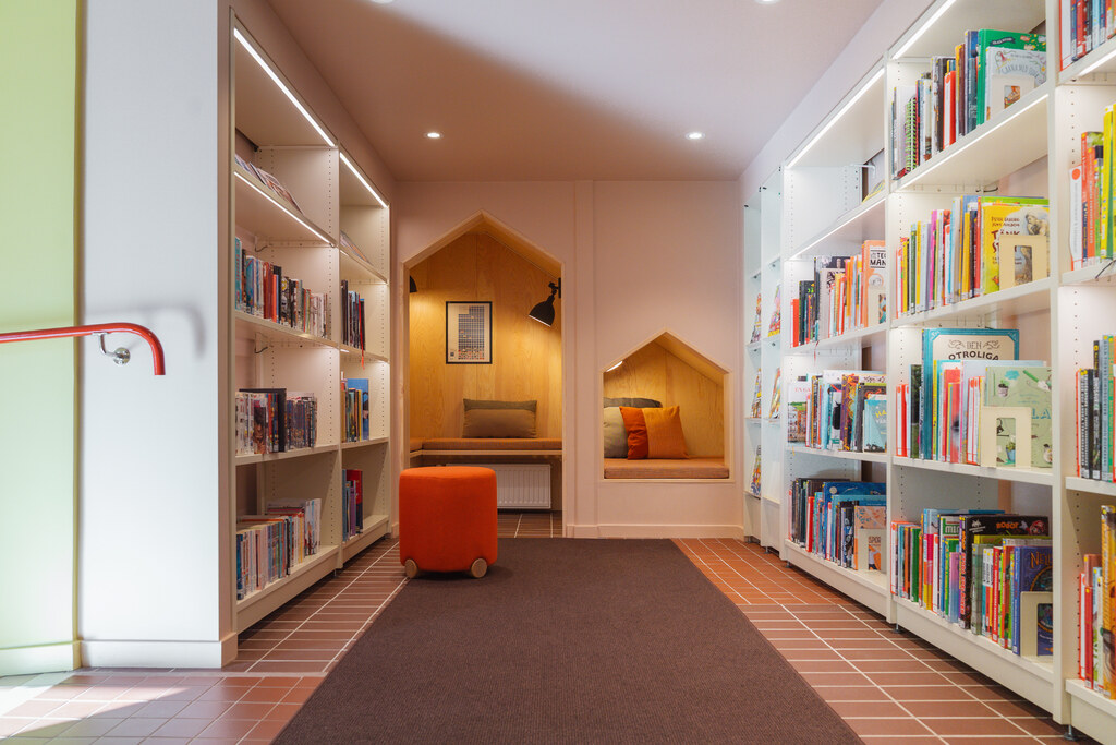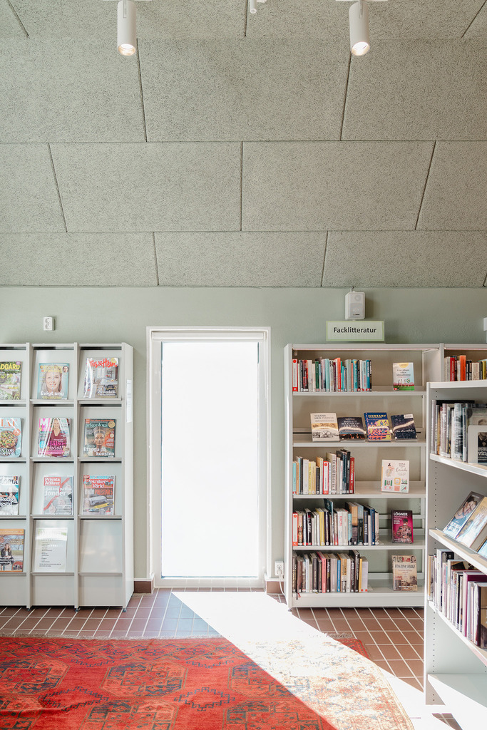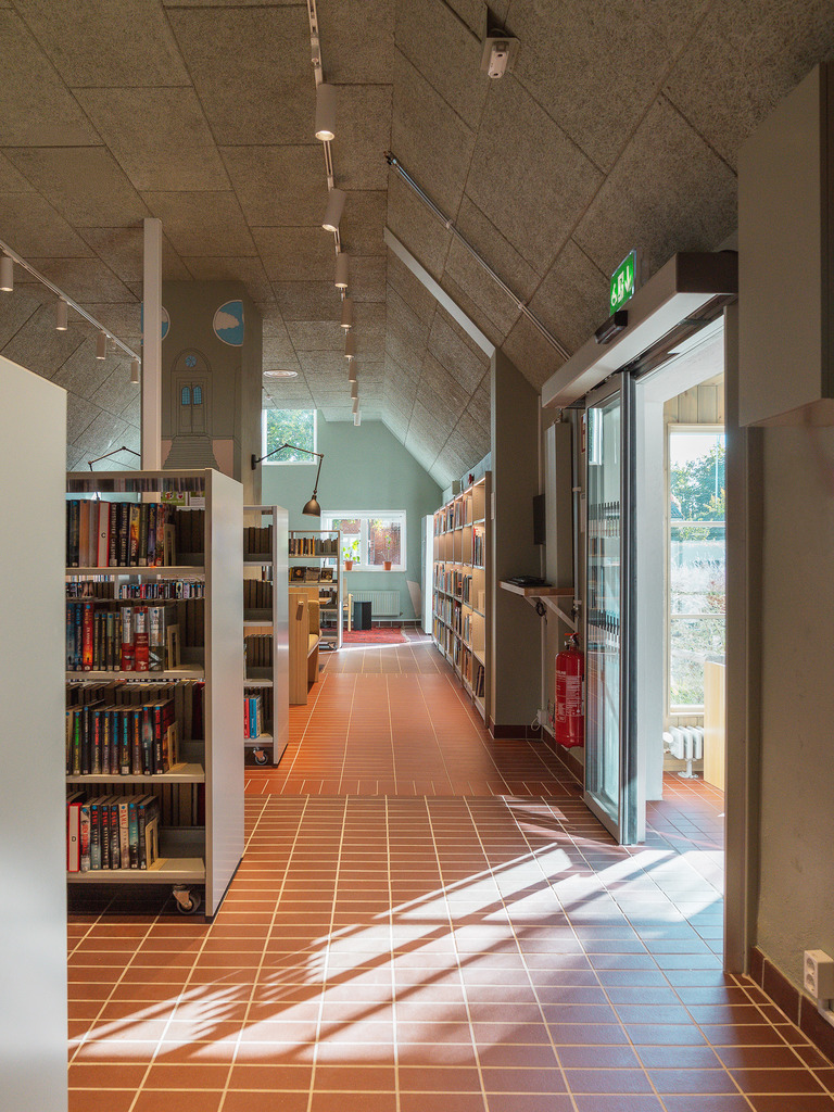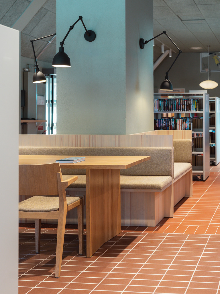 Gårdshusen har fått en liten tillbyggnad, nu huvudentré för kulturverksamheterna. Vindfånget underlättar flödet och förbättrar bibliotekets användbarhet för såväl besökare som personal. Principen för ombyggnaden har varit att hushålla med det som finns på plats och endast lägga till om det är nödvändigt. Därför har möbler som fanns på plats rekonitionerats och årerbrukats och de nya fasta möblerna har fått en slitstark design i massivträ och sittyra av ulltextilier. I lagningen och läggningen av golven har principen efterföljt och det sällsynta Höganäs-klinkret demonterats för att kunna laga i på utvalda synliga ställen. De nya tilläggen av golv har fått utformas så att det lätt går att utläsa som ett tillägg. Rampen till barnavdelningen har ett eget mönster, inspirerat av trasmattor.