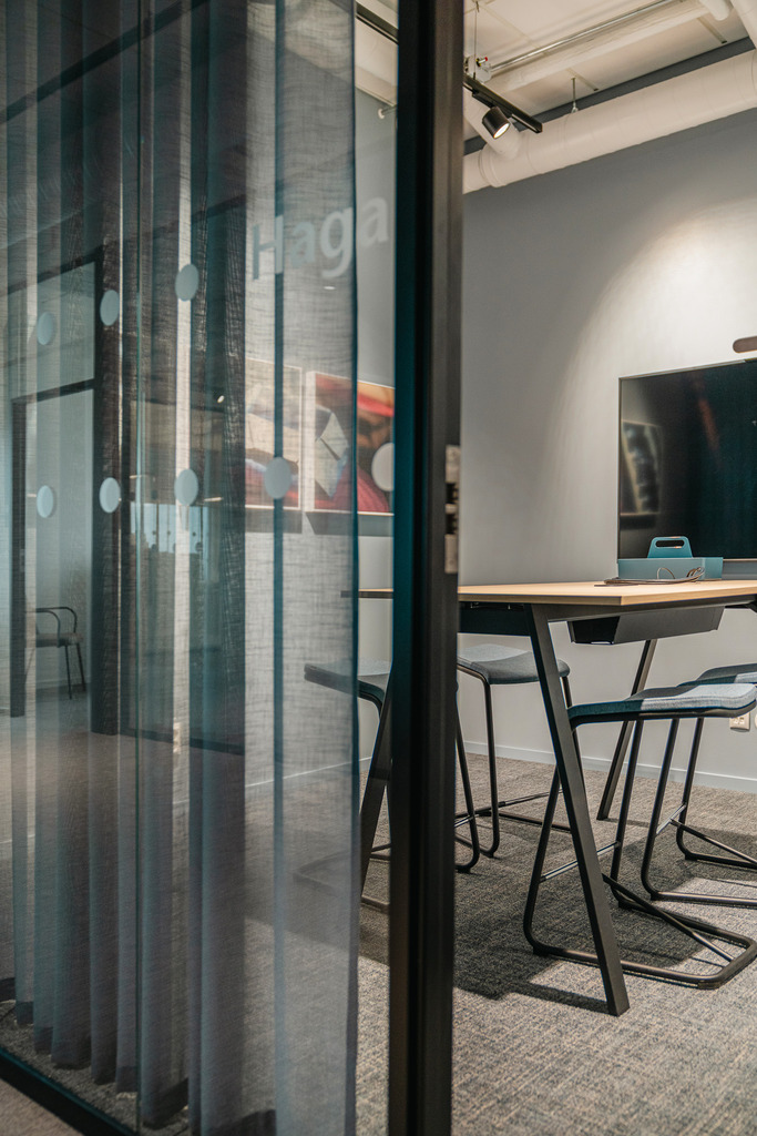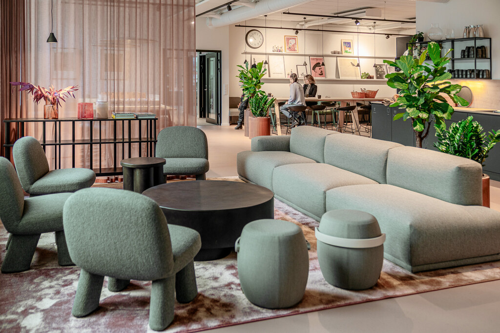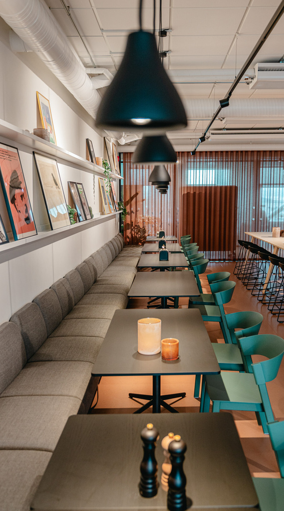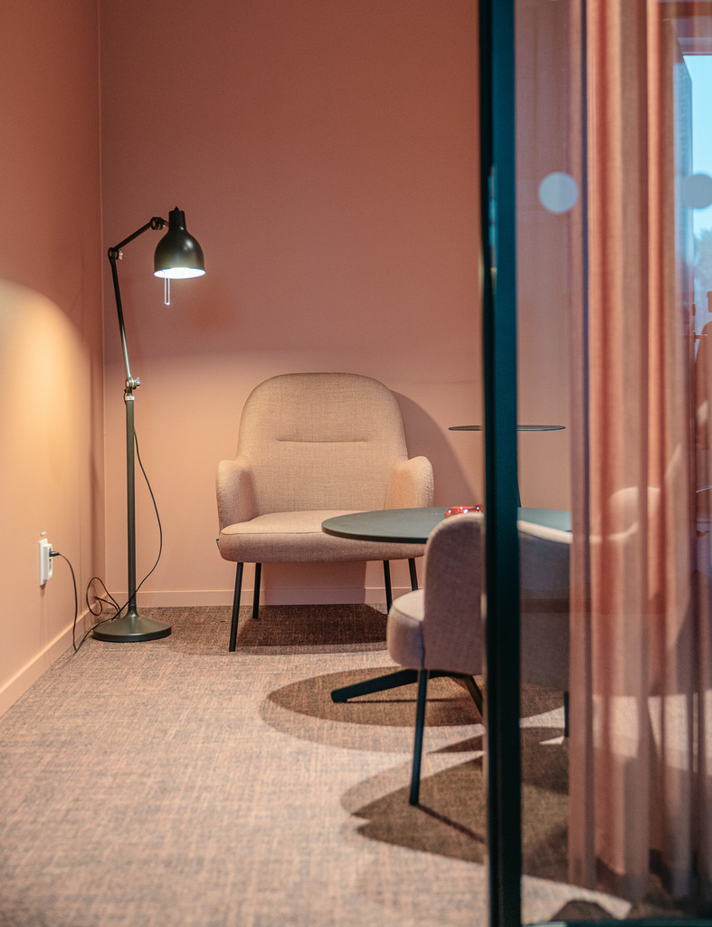 Färgsättningen är väl avvägd: en mjuk bas i gråbeige skapar en lugn och tidlös grund, medan konceptkulörer knyter an till företagets grafiska profil och ger identitet och energi. Mötesrummen varierar i uttryck och utformning, från mustiga toner till mer neutrala miljöer, vilket gör att de kan anpassas efter situation och behov. Kombinationen av interna och externa mötesrum, teamytor och tysta arbetsrum skapar en arbetsplats som erbjuder valfrihet och stödjer både koncentrerat arbete och samarbete. Entré- och gemensamhetsytorna är utformade för att andas välkomnande och gemenskap. Kopplingen mellan entré, kök och bistro skapar naturliga mötesplatser som kompletteras av mjuka loungemiljöer, traditionell lunchsittning och flexibla projektarbetsplatser. Variationen bidrar till ett levande kontor där cirka 130 medarbetare kan välja arbetsmiljö utifrån behov, dagsform och arbetsuppgift.