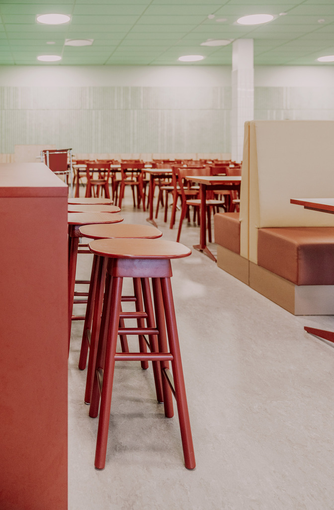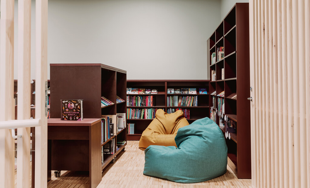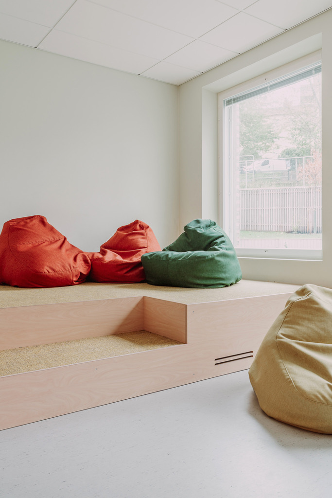 Interiören i Sandarnaskolan präglas av ljusa material, pastellfärgade accenter och omsorgsfulla detaljer som skapar en harmonisk och trygg miljö. Från skolans entréhall till klassrum och bibliotek möts funktion, trivsel och gemenskap i genomtänkta lösningar som främjar lärande och samvaro.