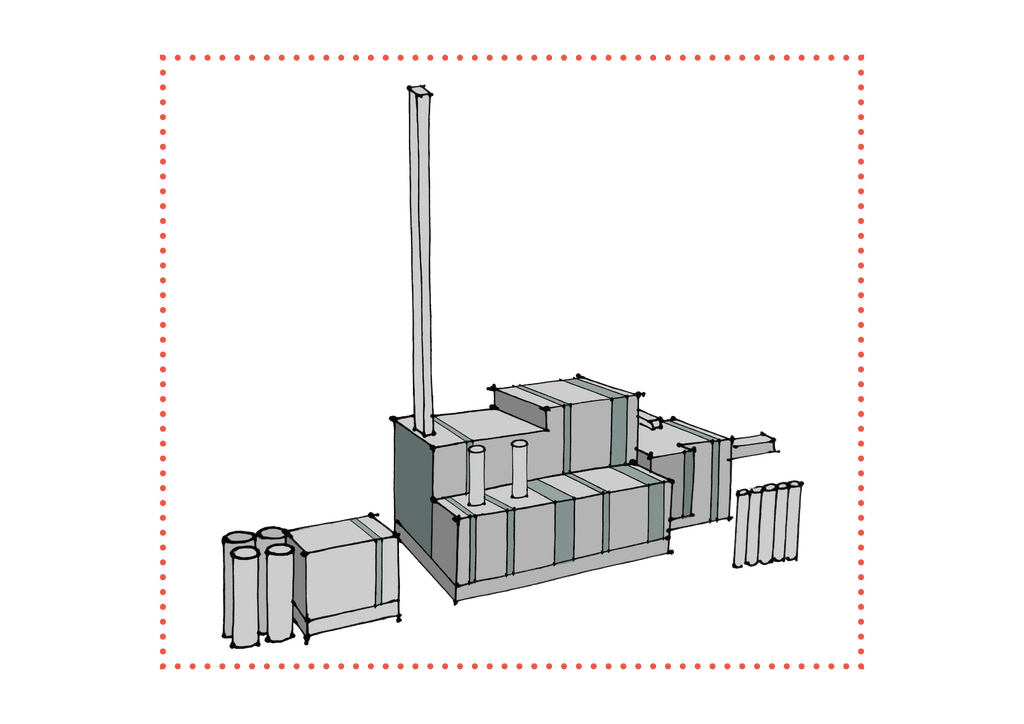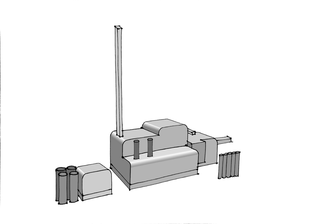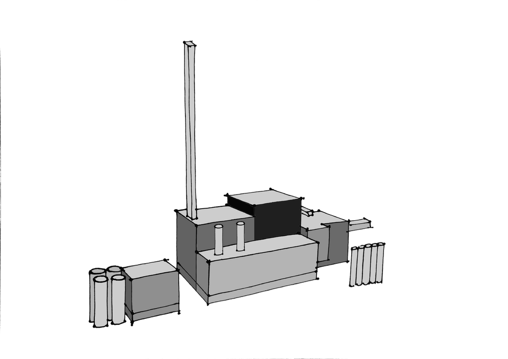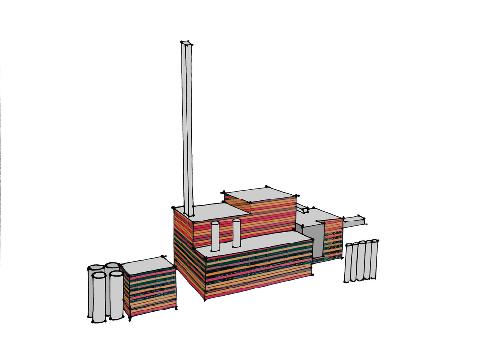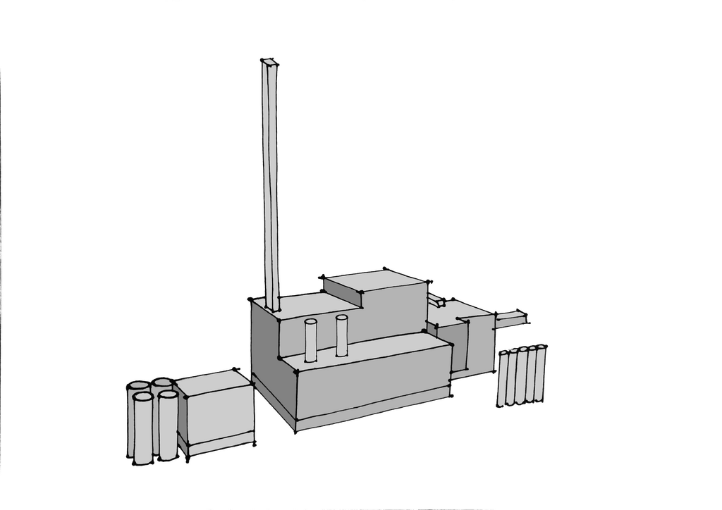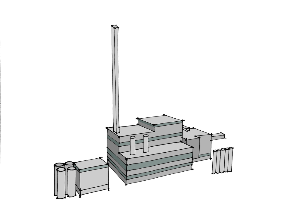 Genom utforskande designprocess undersöktes möjligheter av hur färg och form påverkar skala och uttryck. Vi har gemensamt identifierat ställningstaganden där vi bland de tidiga skisserna valt att arbeta vidare med att tydligt bryta av mot befintlig anläggning och hämta inspiration från klassisk industriarkitektur med förstärkt vertikalitet. Vi har testat valt och valt bort. När vi delade upp den nya anläggningen vertikalt skapades en rytm och balans i volymerna som vi uppskattade. Materialmässigt konstaterade vi att vi bör bryta av mot det befintliga verket.
