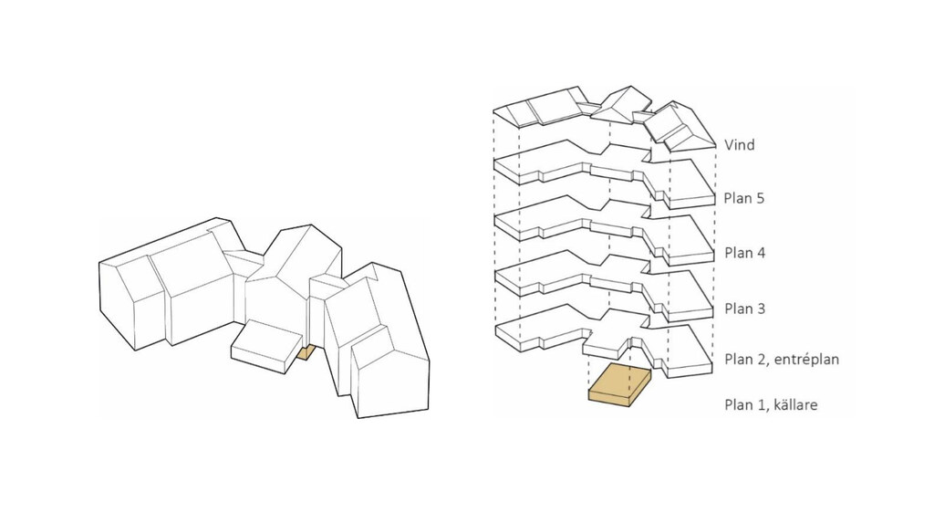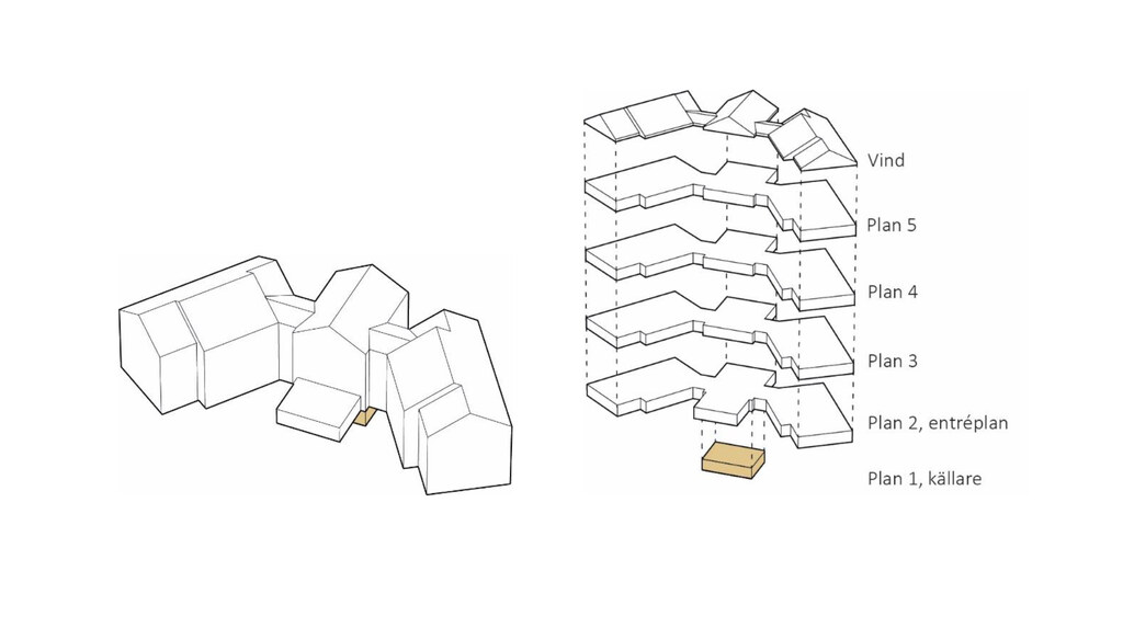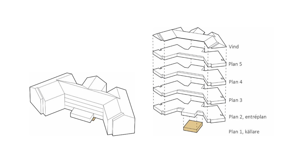 Planbestämmelserna anger att högst fyra våningar tillåts ovan mark, omfattande 7200 kvadratmeter BTA som mest. Utöver detta får källare och vind förekomma. Akutellt utförande är utformning nr 4 längst ned till höger. Volym- och sprängskisser av What! arkitektur.