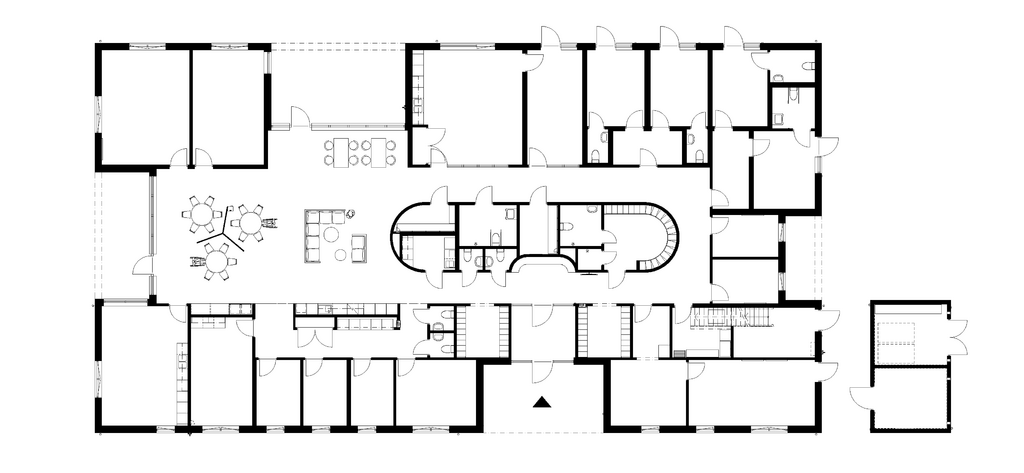 Rummen som omger noden har medvetet olika storlek och inredningskaraktär, med generella former som möjliggör flexibel omställning för olika typer av verksamheter. Den centrala mötesytan får rikligt med dagsljus från flera håll och har direkt kontakt med både uteplats och trädgård.
